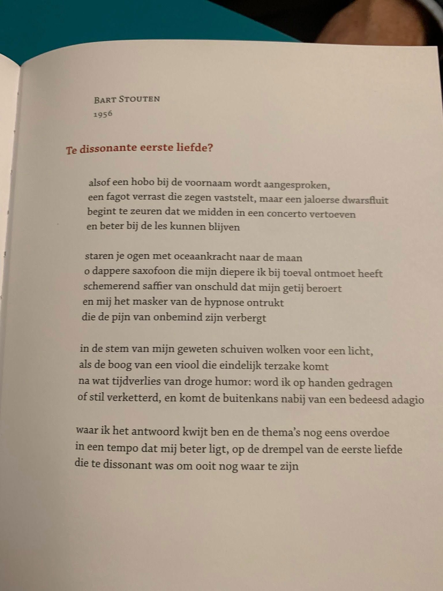 Links zie je mijn muziekgedicht dat geselecteerd werd voor de bloemlezing 'Weet jij de wijs nog en de woorden', van bloemlezers René Smeets en Johan van Cauwenberge. (Uitgeverij P). Ik ben in goed gezelschap: Vondel, Bertus Aafjes, Guido Gezelle, Hugo Claus, Anna Enquist en Leonard Nolens. Maar ook Federico Garcia Lorca, Aleksandr Poesjkin, Tomas Tranströmer... wat een eer!